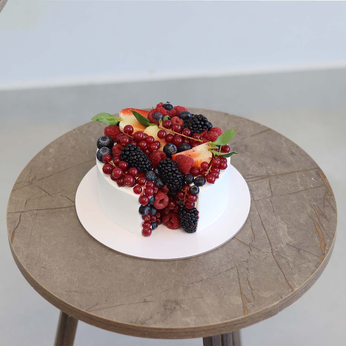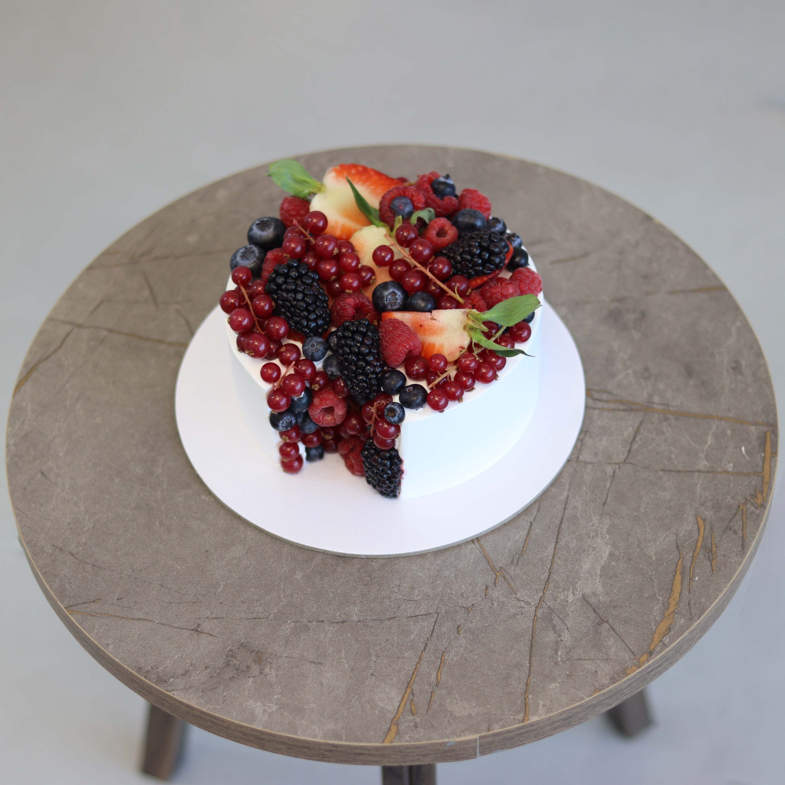 Vanilla cake garnished with Bunch of fruits like strawberry, blueberry, raspberry and other mix of fruits (Size: medium).