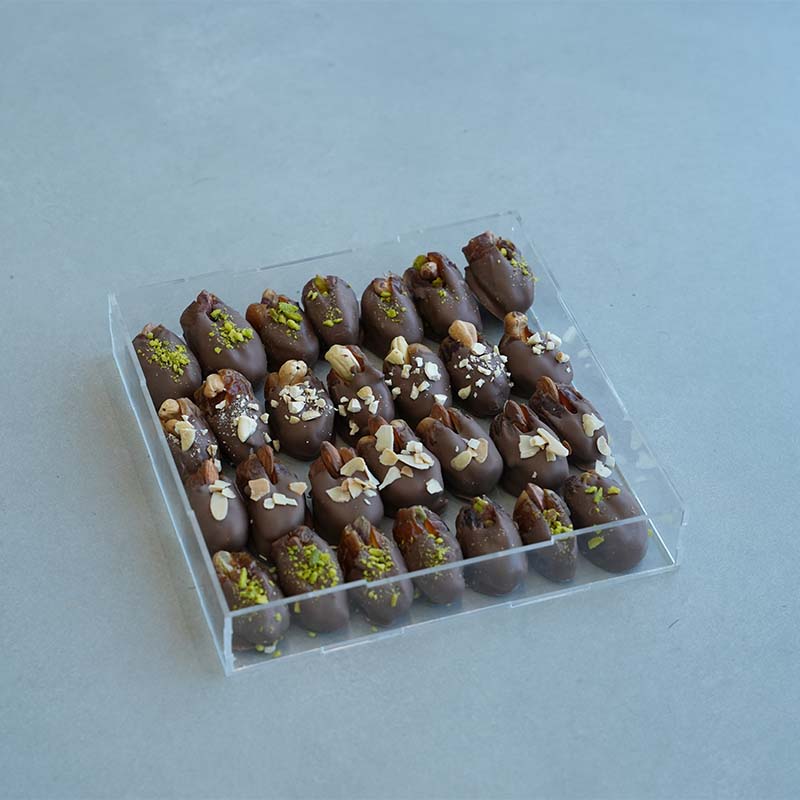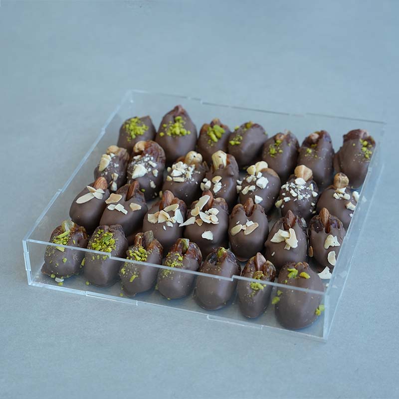 Dates Stuffed with premium nuts and topped with a sprinkle of almonds, pistachios, and Cashew. this offers a sweet blend of rich chocolate and the natural sweetness of dates arranged in a Acrylic Tray .