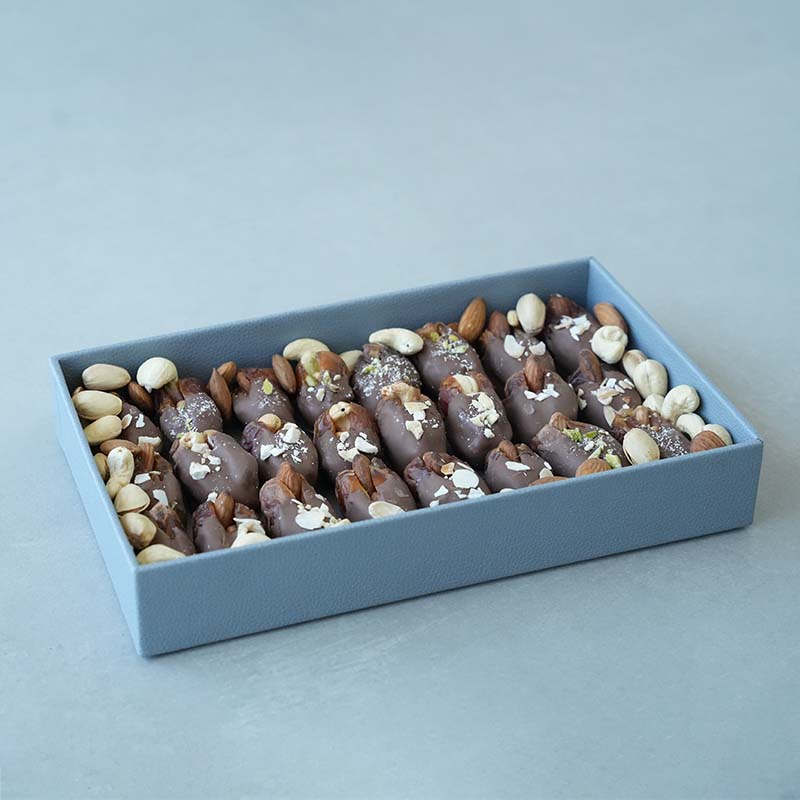 Dates Stuffed with premium nuts and topped with a sprinkle of almonds, pistachios, and Cashew. this offers a sweet blend of rich chocolate and the natural sweetness of dates arranged in a Leather Box.