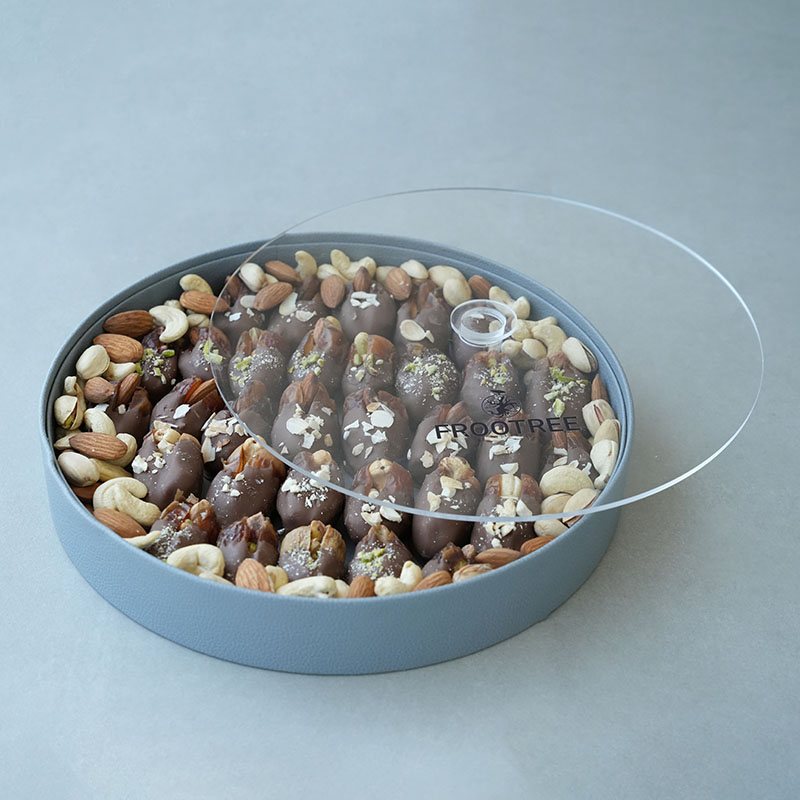 Dates Stuffed with premium nuts and topped with a sprinkle of almonds, pistachios, and Cashew. this offers a sweet blend of rich chocolate and the natural sweetness of dates arranged in a Leather Box . Tray filled with Stuffed Dates and Nuts.