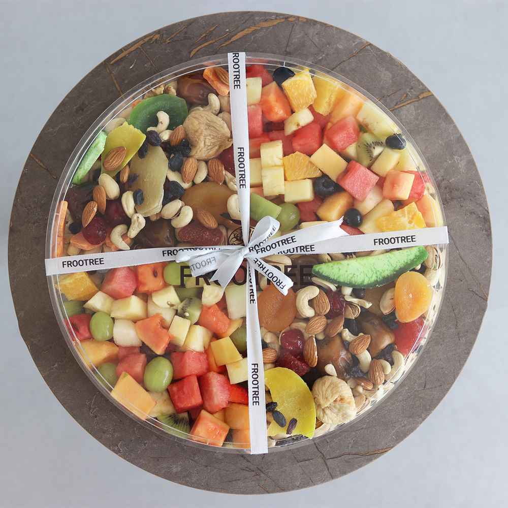A mix of cut fruits, including Grapes, Orange, Kiwi, Watermelon, Melons and other mix of Nut and Dry fruits like Pistachio, Cashew nuts, Apricot, figs, Risin, Dates are arranged in a Crystal Vase