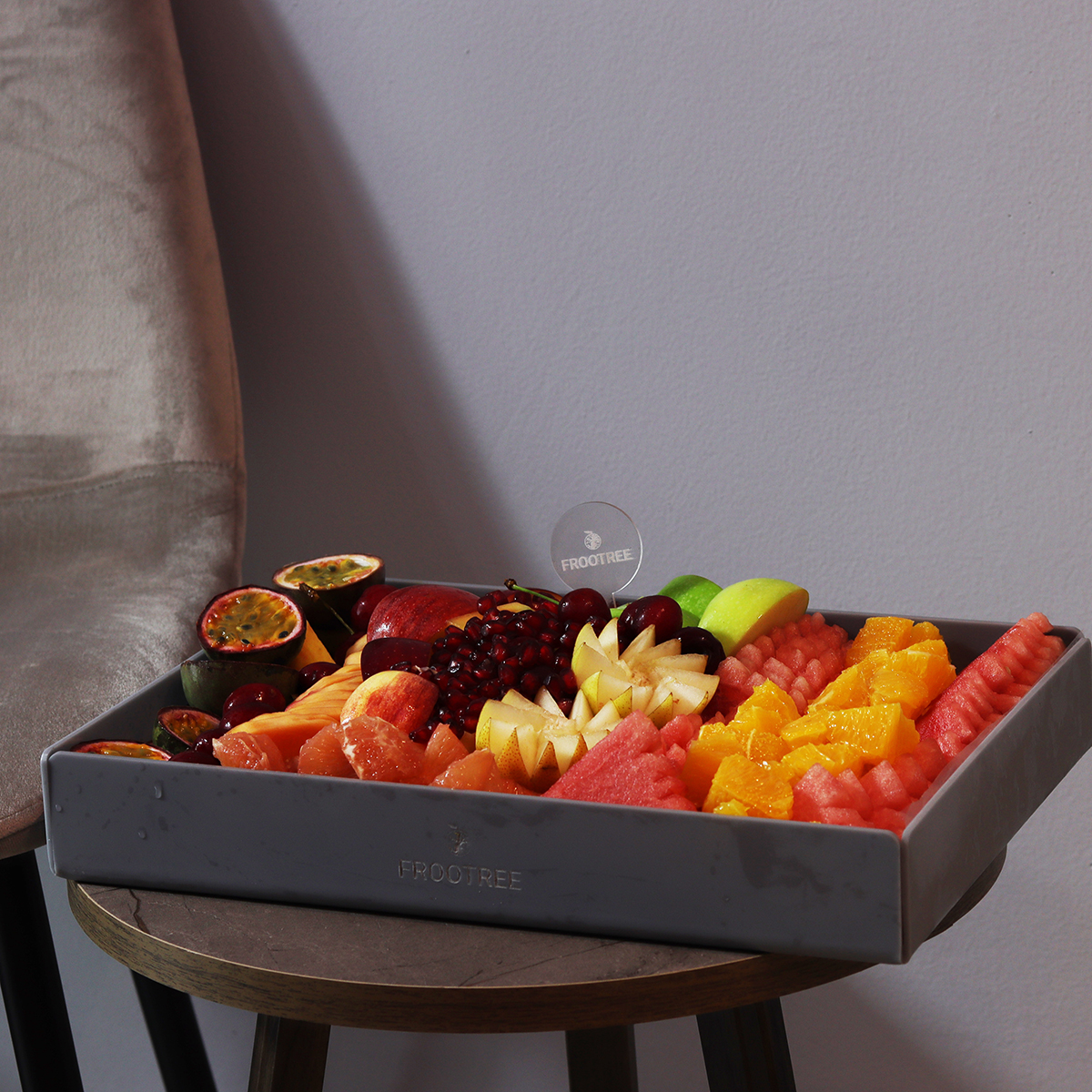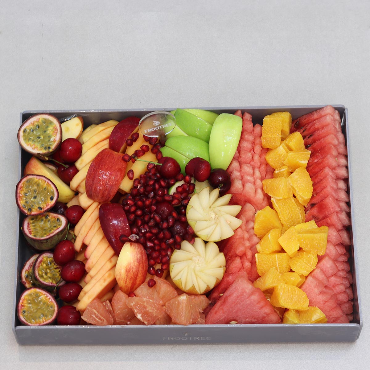 A mix of cut fruits, including Water melon, Grapes, Orange, Cherry, Passion Fruit, Rose Apple, Apple, Pomegranite and other mix of Fruits arranged in a Small Acrylic Tray (30*20cm)