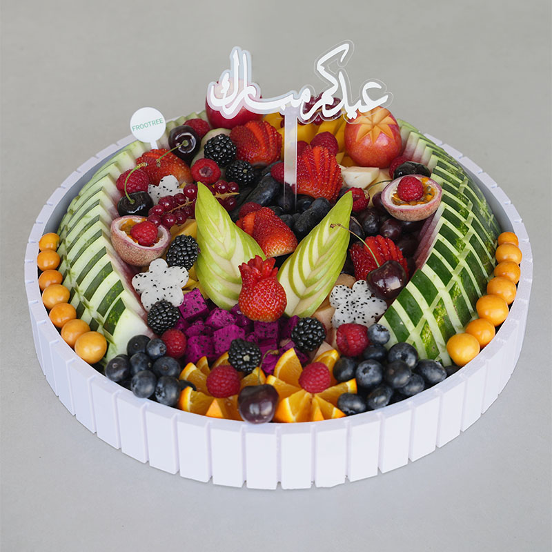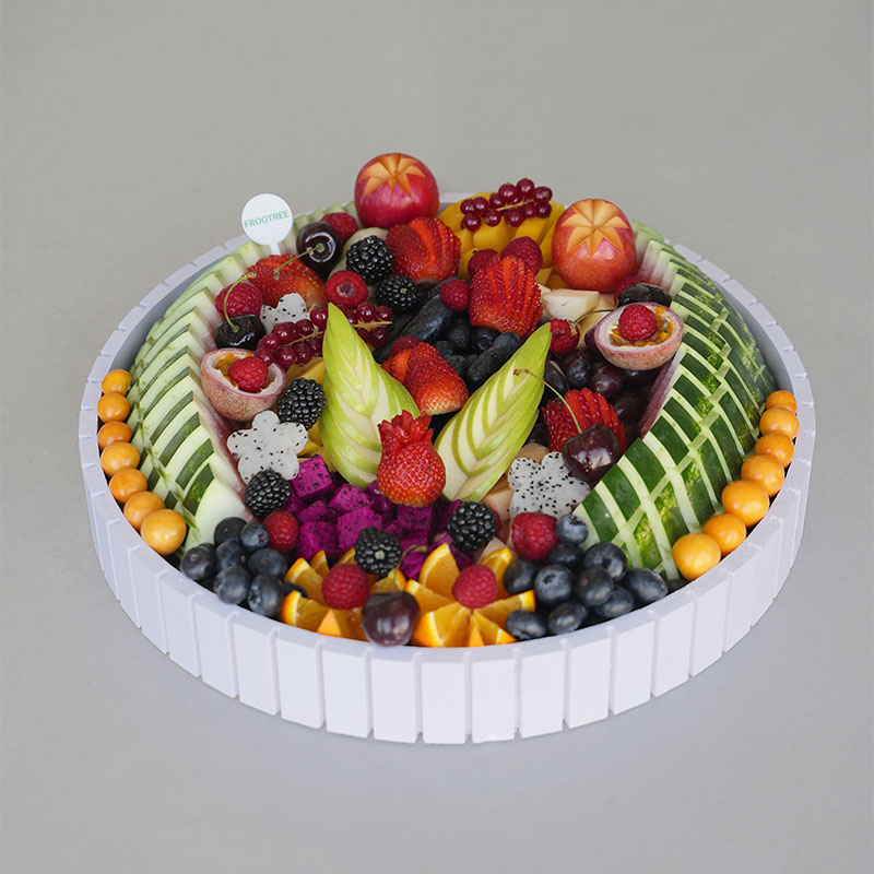 A mix of fruits, including Grapes, WaterMelon, Melons, Kiwi, Bluberry, Strawberry, Guava, Dragon Fruit and other mix of Seasonal fruits arranged in a Tray (38cm)