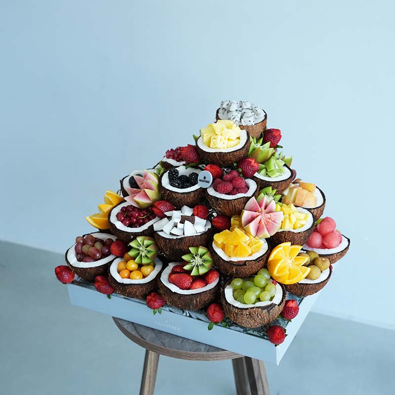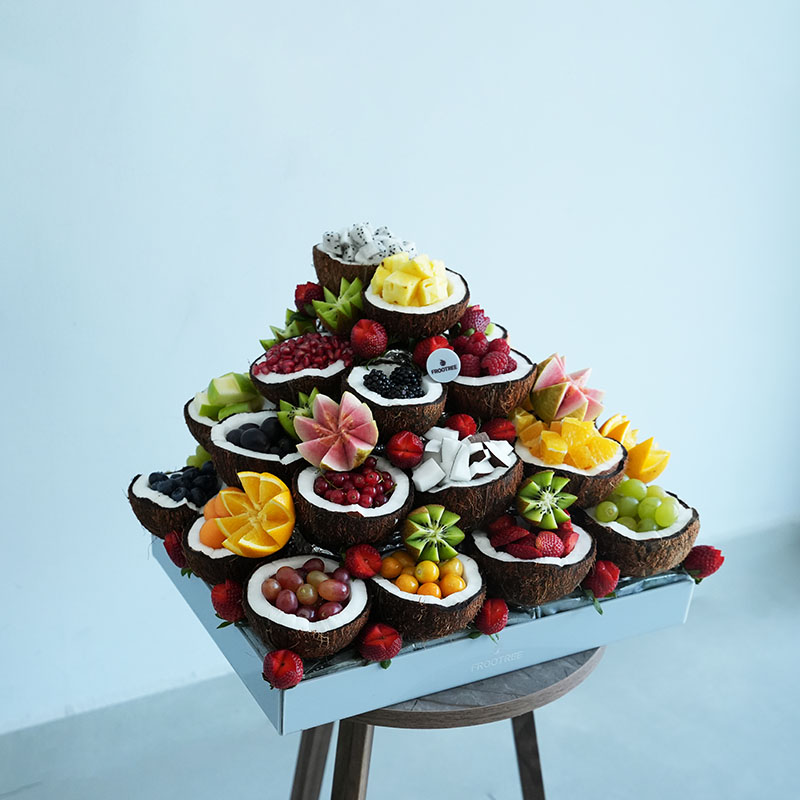 A mix of cut fruits, including Strawberry, Kiwi, Grapes, Raspberry, Bluberry, Melons, Dragon Fruit, Pineapple, Guava, Blackberry, Apple and other mix of Fruits arranged in a Coconut Cup like a mountain.