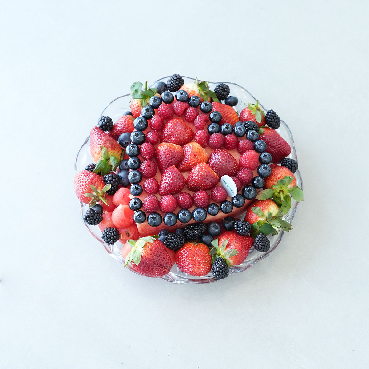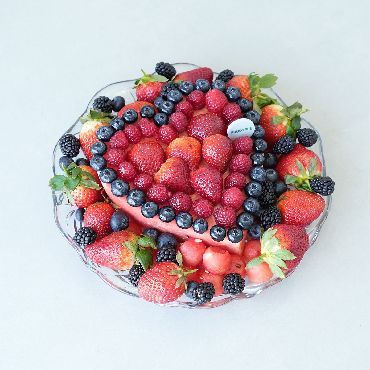 A mix of cut fruits including Blue Berry, Raspberry, Blackberry, Watermelon, Strawberry and other mix of fruits arranged in a Crystal Plate ( diameter 30cm)