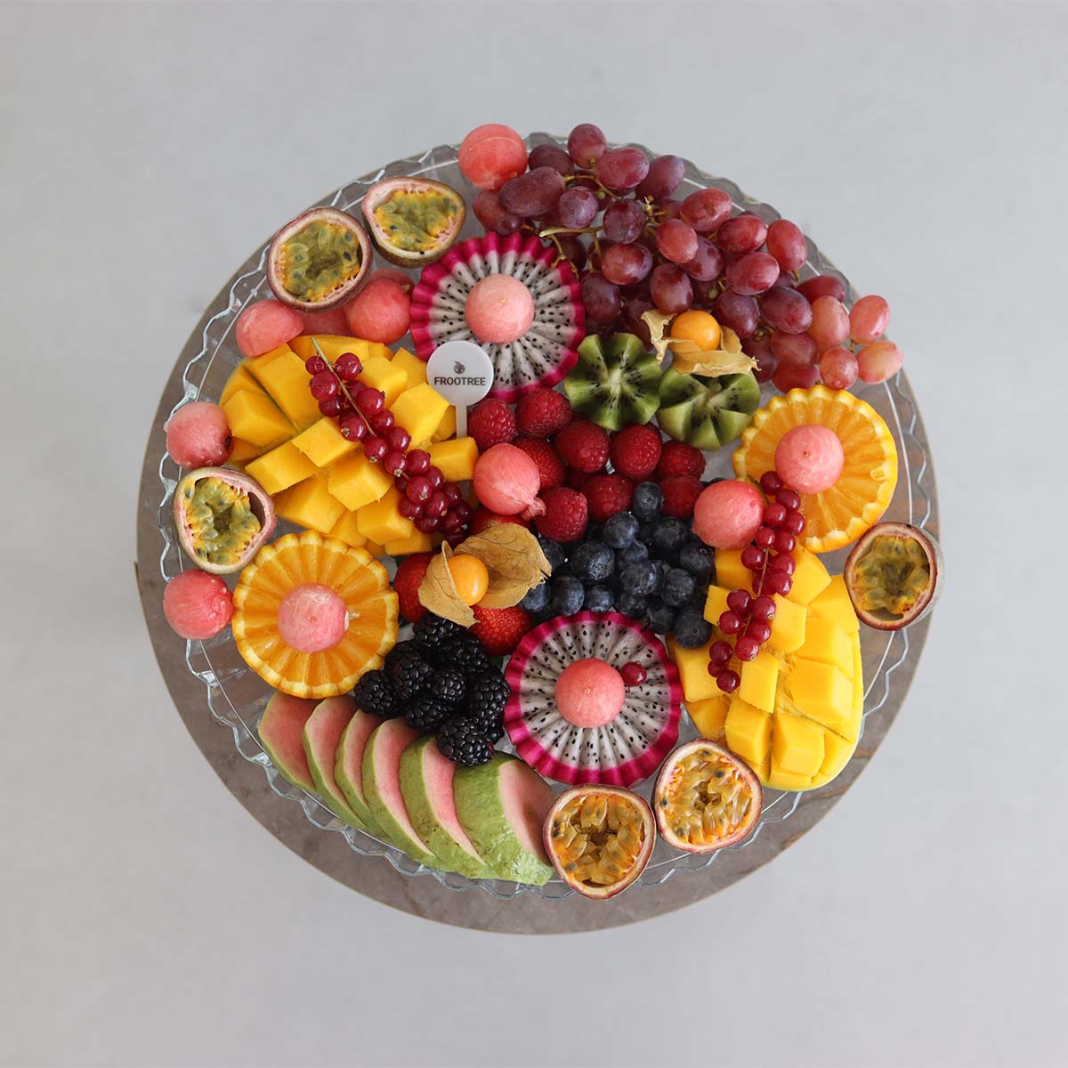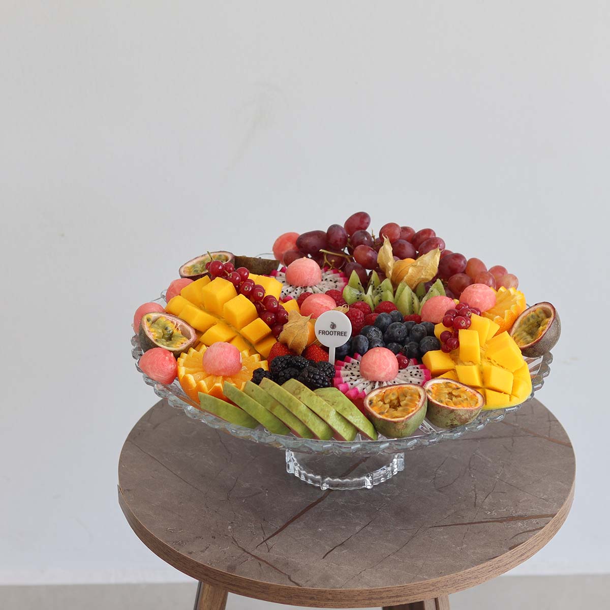 A mix of cut fruits, including Bluberry, Grapes, Mango, Dragon Fruit, Orange and other mix of Fruits arranged with fruit cake in a Crystal Vase.