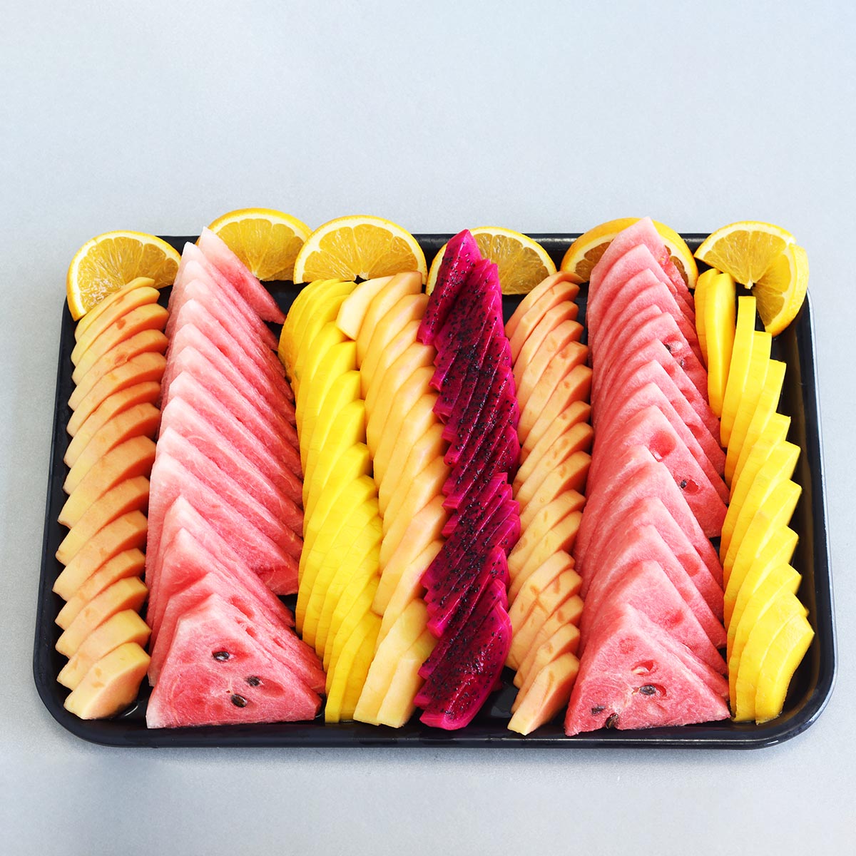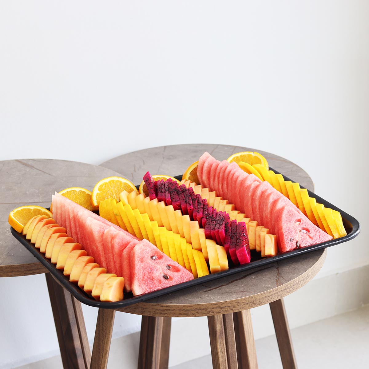 A mix of cut fruits, including Dragon Fruit, , Water melon, Mango, Orange, Melons and other mix of Fruits arranged in a large Melamine Tray