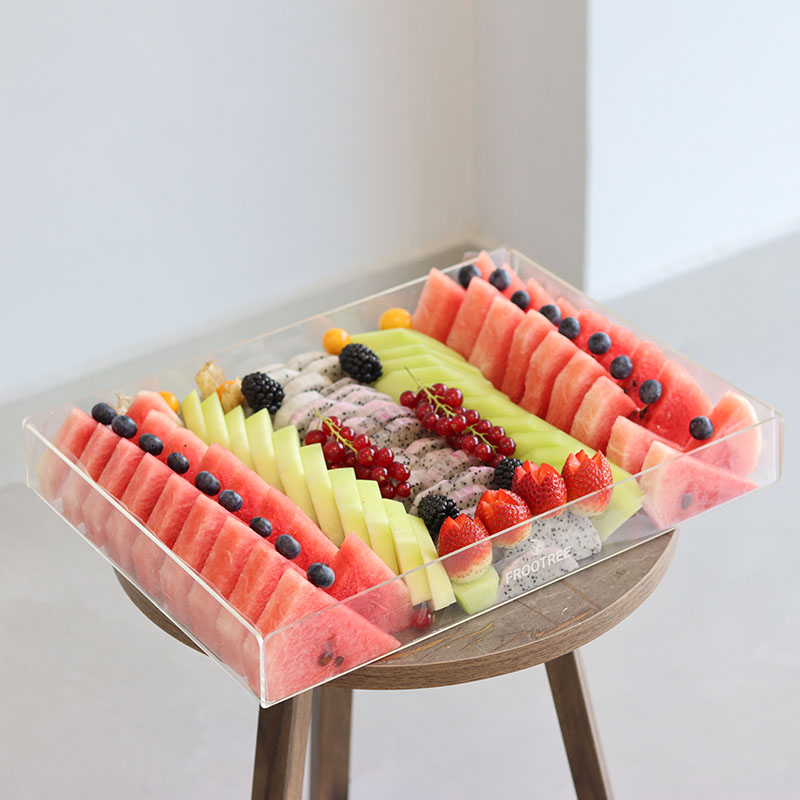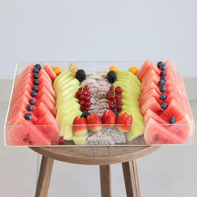 A mix of cut fruits, including Strawberry, Goldenberry, Watermelon, Dragon Fruit, Melon, Blackberry, Blueberry and other mix of Fruits arranged in an Acrylic Tray