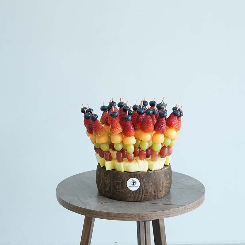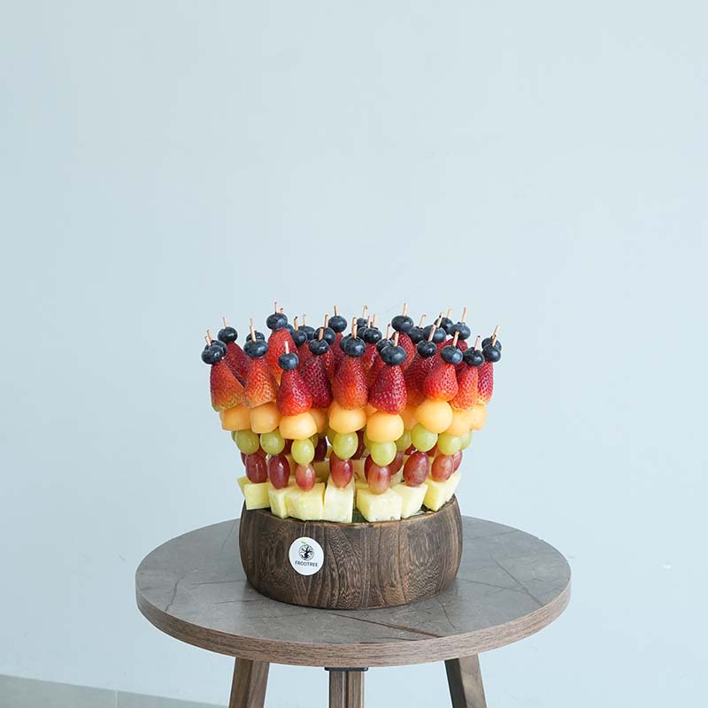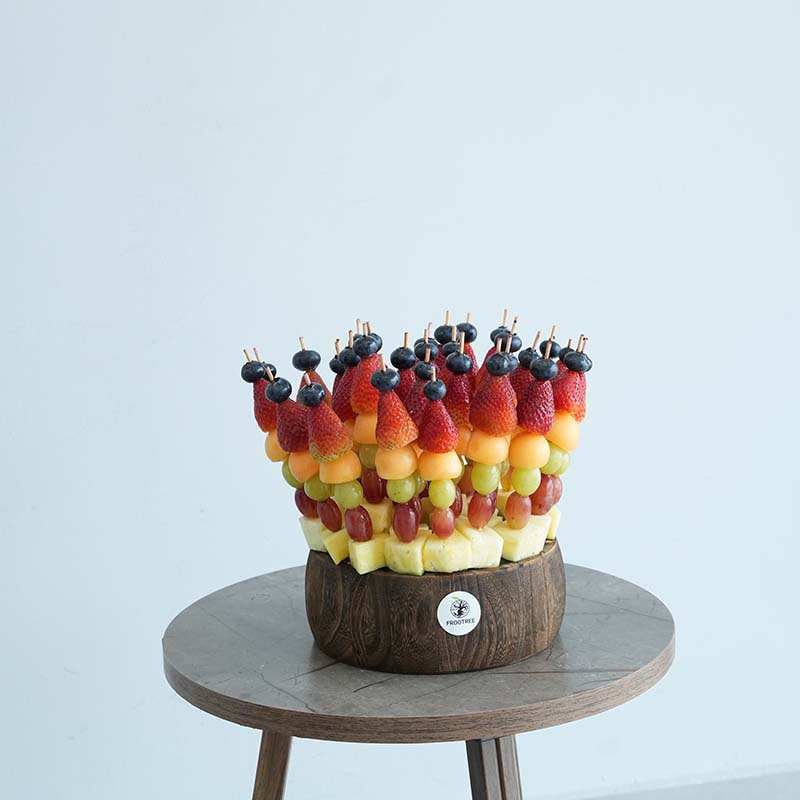A Bouquet with mix of cut fruits including Grapes, Pineapple, Blue Berry, Melons, Strawberry and other mix of fruits arranged in a wooden Vase.