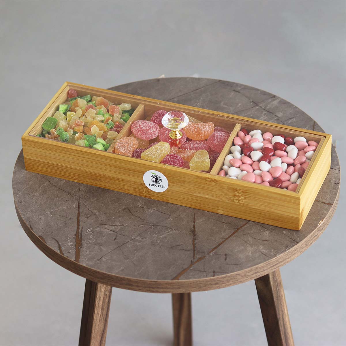 A mix of Chocolate, Dryfruits, Fruit Flovoured Sweets arranged in a Wooden Box Tray