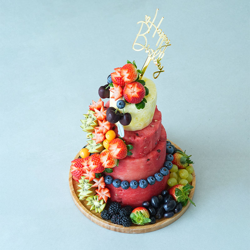 A mix of cut fruits, including Blueberry, Black Berry, Grapes, Strawberry, Kiwi and other mix of Fruits with Two tier Water Melon Cake arranged in a wooden tray