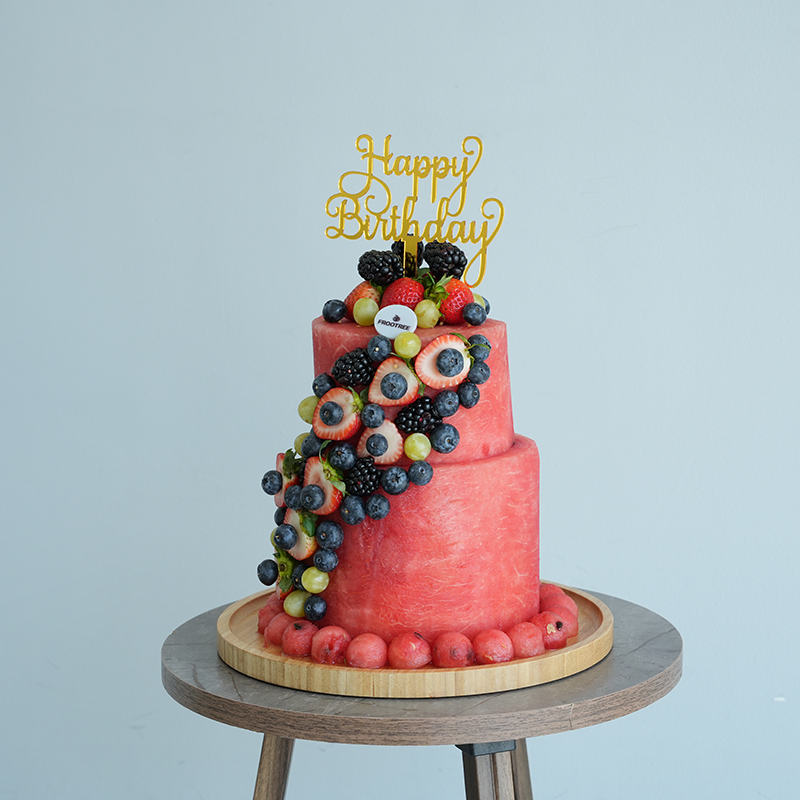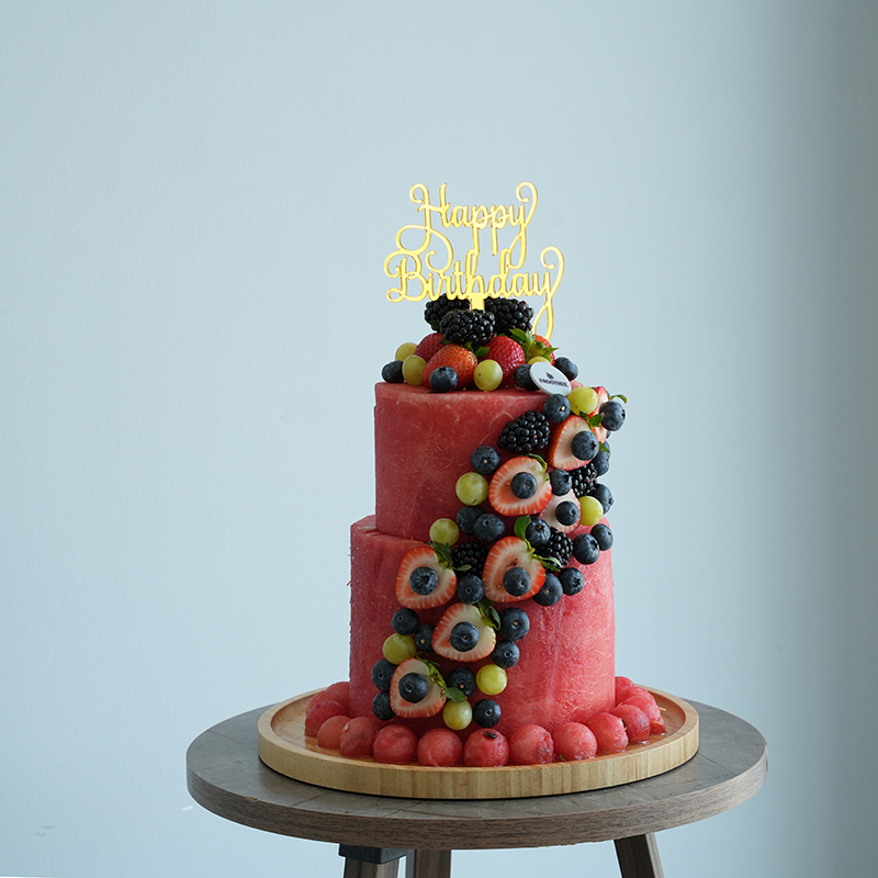 A mix of cut fruits, including Blue Berry, Black Berry, Grapes, Strawberry and other mix of Fruits with Two tier Water Melon Cake arranged in a wooden tray
